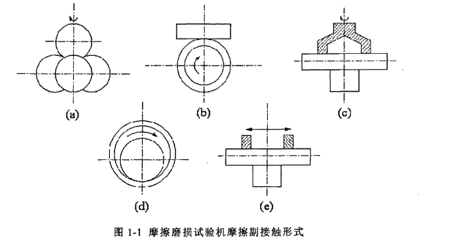常見的摩擦磨損試驗機摩擦副接觸運動方式在下圖中列出,其中a.圖所示的是四球摩擦磨損試驗機的摩擦副接觸方式。上球卡在一個專用彈性夾頭內,下面三個球固定并加以載荷,此種方式下設備試樣接觸形式是典型的點接觸,可以通過測量摩擦力和接觸磨斑直徑的變化來評定潤滑劑的承載能力。b.圖所示的是環塊試驗機摩擦副接觸方式,此種方式下接觸形式為線接觸,通過測量上試樣摩擦力大小和磨痕的寬度來評定上試樣摩擦磨損性能。c.圖所示為端面摩擦磨損試驗機的摩擦副接觸方式。主要采用面接觸形式,上試樣加工呈環形端面,下試樣為待測樣品。特別適合于在油潤滑和干摩擦條件下,對式樣的摩擦磨損性能進行試驗檢測。d.圖所示為PV摩擦磨損試驗機的摩擦副接觸方式,主要用來測定軸承合理的配合間隙和PV值。e.圖所示為往復摩擦磨損試驗機摩擦副接觸方式,上試樣下試樣均加工成塊狀,上試樣以一定額率在下試樣表面做往復運動,以此來評定下試樣的摩擦磨損性能。目前,已有許多新型的多功能摩擦磨損試驗機,他們具有多種試件接觸和運動形式,只要更換試件加劇模塊,就可以完成多種不同類型的實驗和組合實驗。